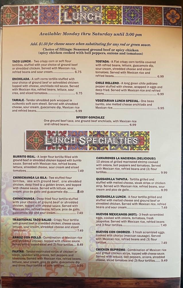 One Chile con carne (a flat crispy tortilla covered with ground beef and cheese sauce). One ground beef taco, one ground beef burrito, one ground beef enchilada. Served with Mexican rice and refried beans.