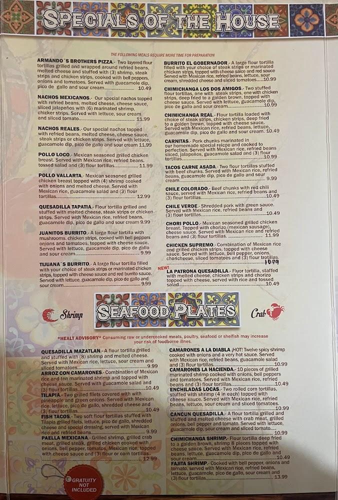Mexican seasoned grilled chicken breast topped with (4) shrimp cooked with onions and melted cheese. Served with Mexican rice, guacamole salad, and (3) flour tortillas.