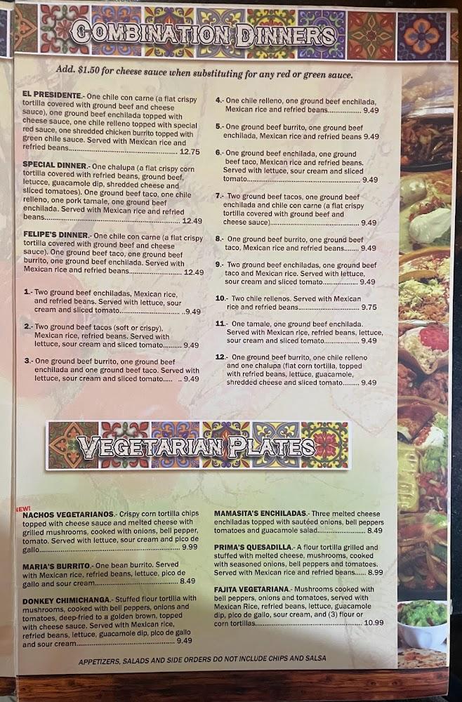 One Chile con carne (a flat crispy tortilla covered with ground beef and cheese sauce), one ground beef enchilada topped with cheese sauce, one Chile relleno topped with special red sauce, one shredded chicken burrito topped with green Chile sauce. Served with Mexican rice and refried beans.
